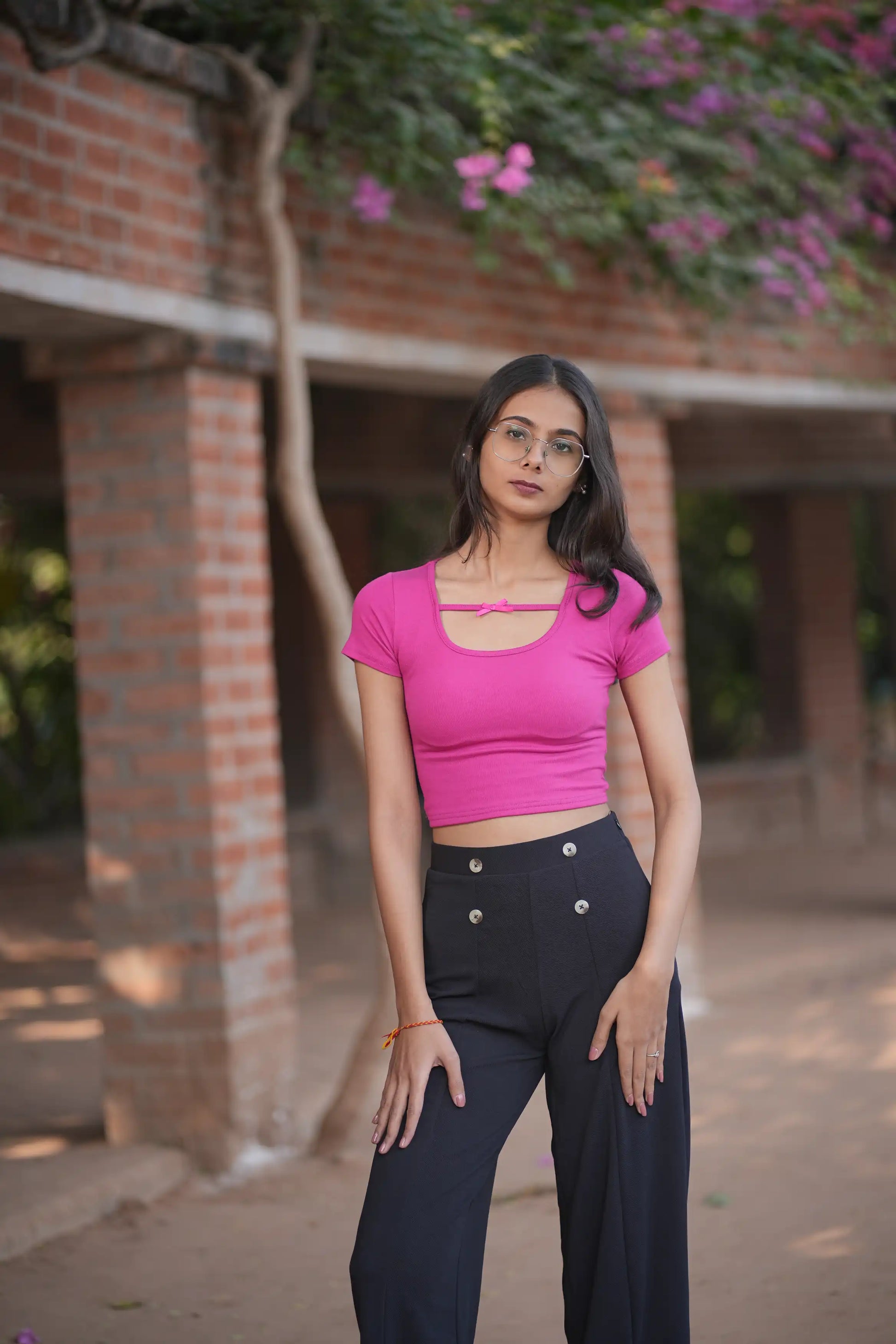 A vibrant magenta-pink crop top with a fitted silhouette. It features a unique scoop neckline accented by a horizontal strap and a delicate miniature bow detail, adding a touch of feminine charm to the minimalist design.